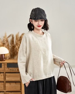 2025秋季新款纯色小立领套头简约纯色宽松气质亚麻亲肤百搭体恤衫