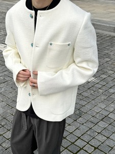 法式无领正肩夹克春秋季小众设计高级感小香风垫肩痞帅风男模外套