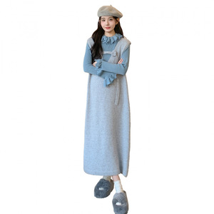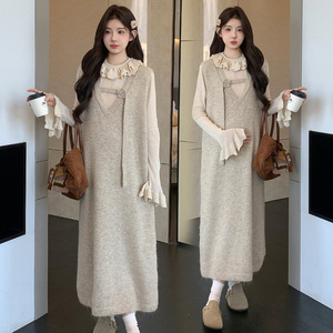 现货2025秋冬韩系花边打底毛衣+孕妇背带裙两件套长袖套装