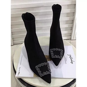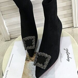 女鞋黑色靴子女2025秋季水钻尖头高跟鞋方扣弹力靴短靴低跟瘦