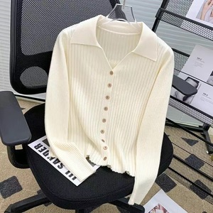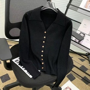 法式polo翻领坑条长袖针织开衫女秋冬季洋气修身显瘦毛衣外套上衣
