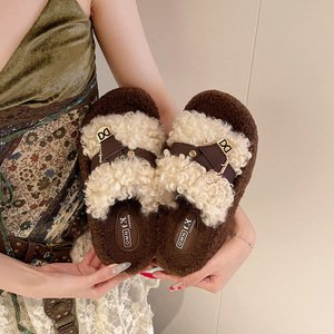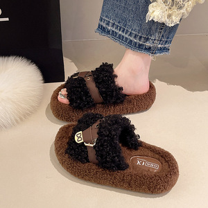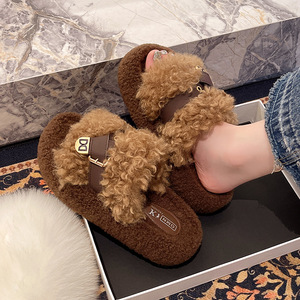 厚底毛毛拖鞋女外穿2025秋季新款时尚皮带扣懒人休闲泰迪卷毛拖鞋