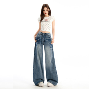 美式复古蓝铆钉阔腿牛仔裤女2025秋季新款做旧街头宽松直筒裤子
