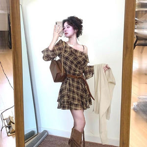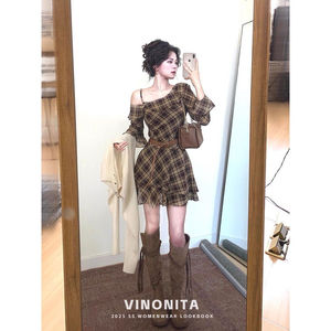 法式复古荷叶边格纹长袖斜肩连衣裙绝美巨好看的小裙子