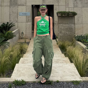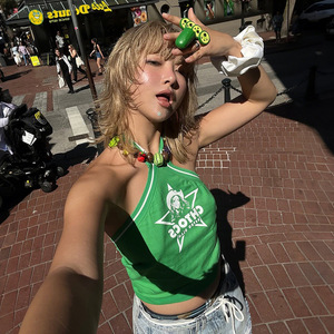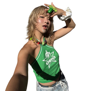 跨境时尚2025秋季新品女装潮人辣妹印花百搭挂脖露背修身短款背心