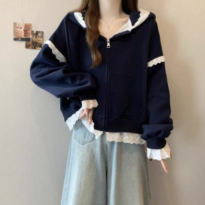 欧货连帽卫衣开衫外套女春秋新款大码胖mm显瘦高级感蕾丝花边上衣