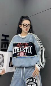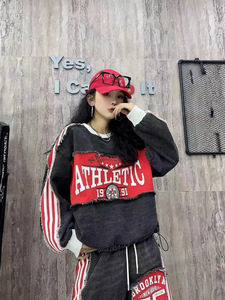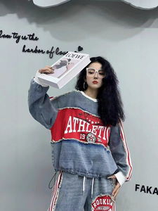 欧货牛仔卫衣女2025秋季新款个性撞色数字母印花毛边下摆抽绳T恤