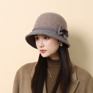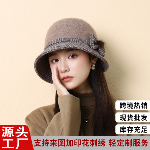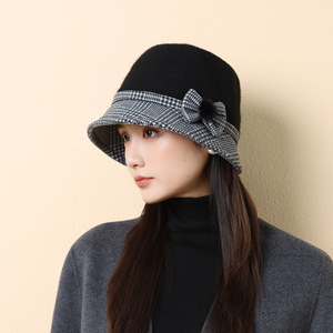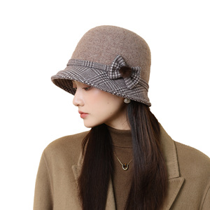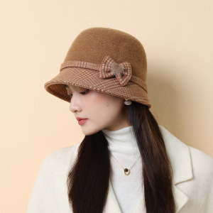 秋冬季新款蝴蝶结洋气渔夫帽女百搭毛呢气质盆帽妈妈户外保暖帽子