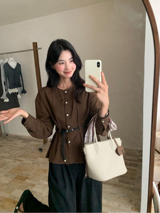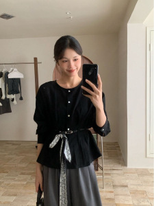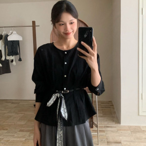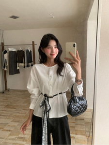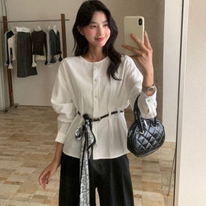 韩版气质配腰带丝巾衬衫女2025秋季设计感收腰显瘦圆领上衣