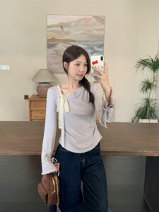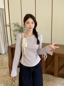 2025年大码法式紫色斜领长袖T恤女秋蝴蝶结系带打底衫显瘦上衣