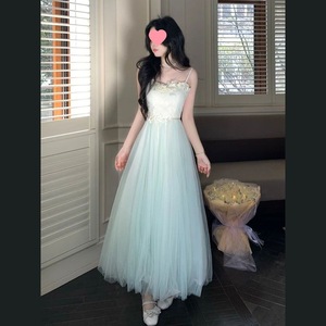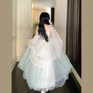 氛围感穿搭方领薄荷绿网纱梦幻公主收腰连衣裙开衫套装