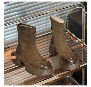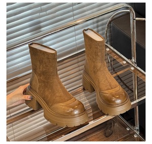 2025秋冬新款百搭绒面套筒短靴女复古英伦风马丁靴厚底粗跟骑士靴