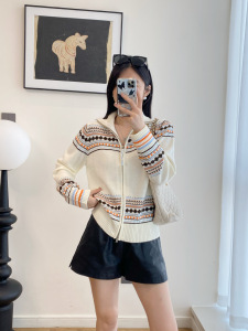 羊毛混纺几何提花撞色拉链针织开衫 090c403