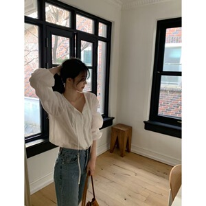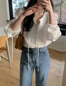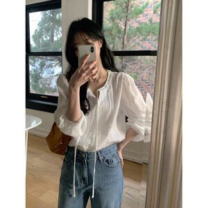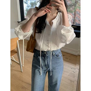 韩国ins甜美小花边领飘带压褶系扣长袖衬衫女气质通勤百搭上衣