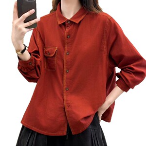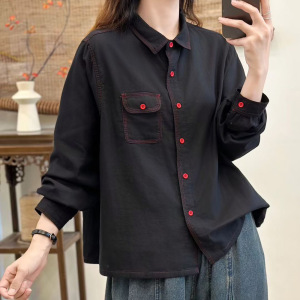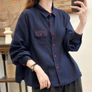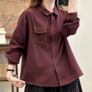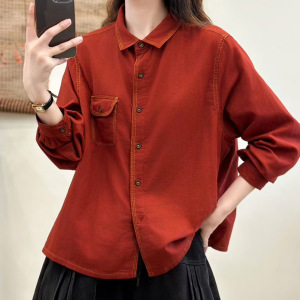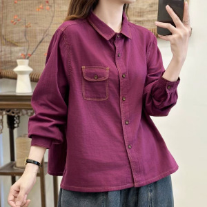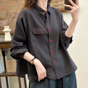 新款文艺休闲简约素色翻领上衣女宽松显瘦百搭休闲衬衫女装
