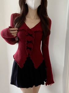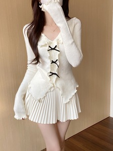 木耳边蝴蝶结v领长袖针织衫女秋冬季开叉收腰显瘦内搭打底衫上衣