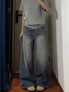 复古做旧直筒牛仔裤女夏大码胖mm高腰宽松显瘦百搭阔腿拖地长裤秋