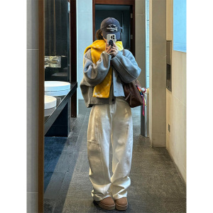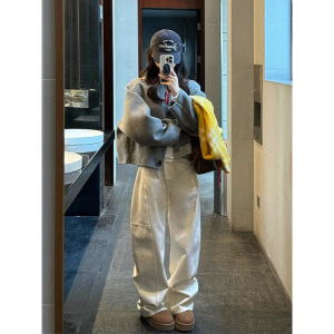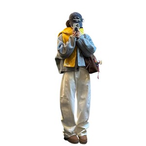 白色解构拼接慵懒风弯刀阔腿牛仔裤女秋宽松cleanfit拖地镰刀裤子