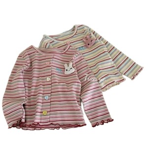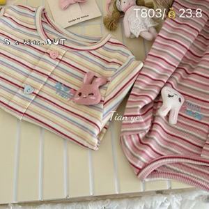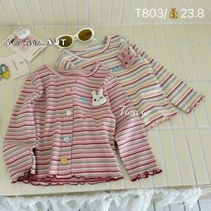 柠里秋季木耳边儿童时尚长袖上衣圆领条纹可爱兔子女童T恤打底衫