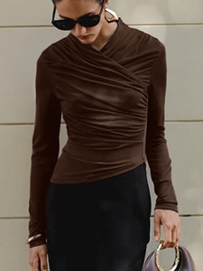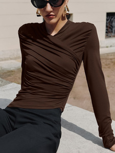 美式修身褶皱高级感v领长袖T恤跨境新款女装复古美拉德秋冬打底衫