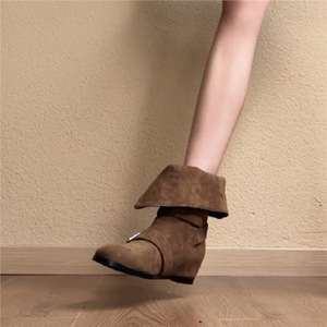 牛皮版~秋冬内西部牛仔靴女复古绒面皮带扣折翻两穿显瘦短靴