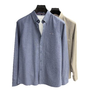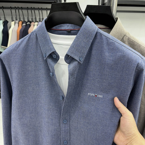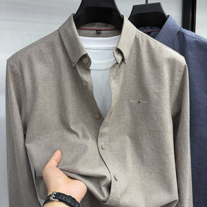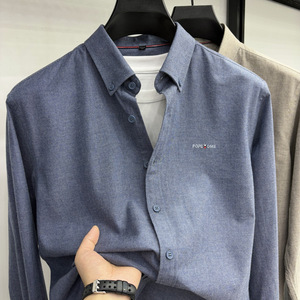 轻奢高级100%纯棉长袖衬衫5新款休闲纯色全棉衬衣男时尚刺绣开衫