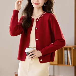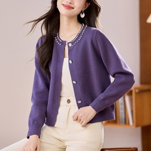 钉珠圆领长袖针织开衫毛衣外套女2025春秋新款高级感外搭短款上衣