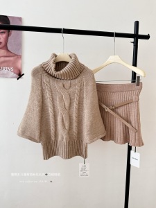 2025斗篷高领麻花外穿针织毛衣外套搭皮带百褶短款高腰半身裙套装