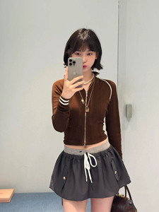 2025年早秋新款Miu南油高定原宿立领拉链宽松外套+松紧腰短裙套装