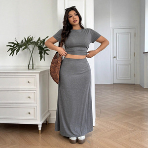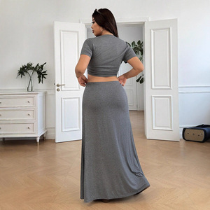 欧美新款时尚灰色套装亚马逊灰圆领修身T恤大裙摆气质半身鱼尾裙
