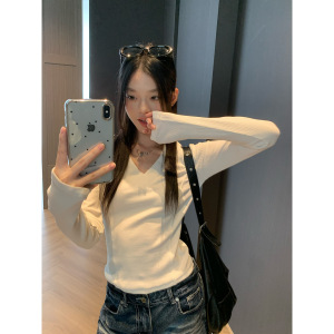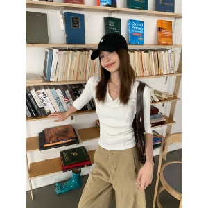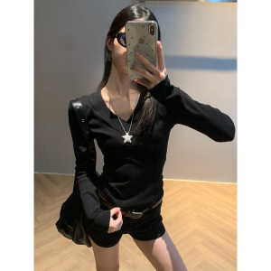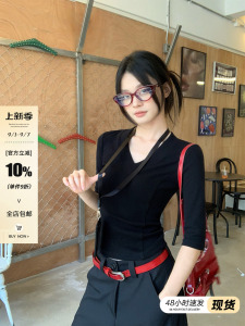 宋正恩黑色V领五分中袖短袖t恤女夏季新款修身设计感短款小上衣潮