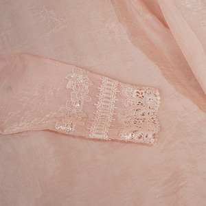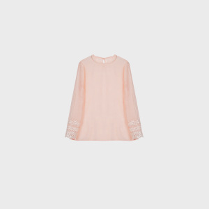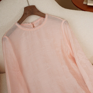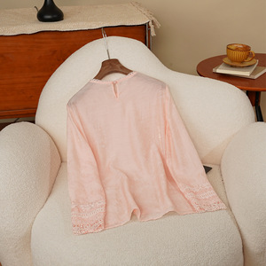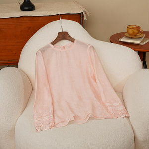 安斐欧娜2025新款天丝提花丝滑光泽圆领蕾丝花边套头长袖女衬衫