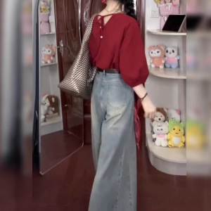早秋穿搭设计感红色圆领镂空半袖衬衫上衣高腰宽松阔腿裤套装