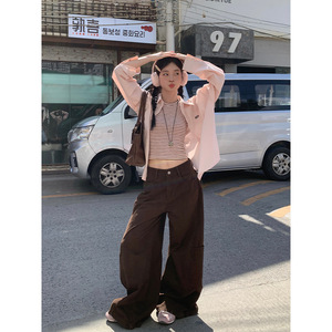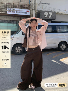 宋正恩咖色阔腿牛仔工装裤女2025秋季新款高腰直筒百搭拖地长裤子