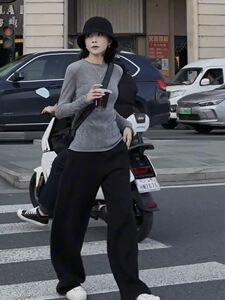 哥家商场同款女装2025秋季百搭修身高级灰圆领针织衫休闲针织长袖