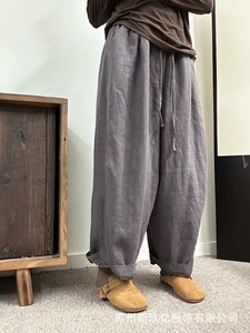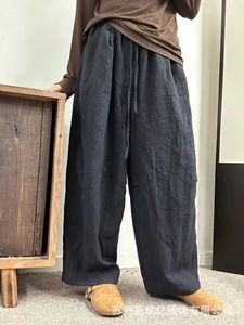 亚麻休闲裤女2025秋季新款复古做旧文艺宽松显瘦腰头撞色百搭长裤