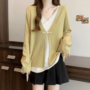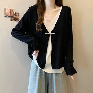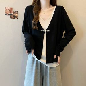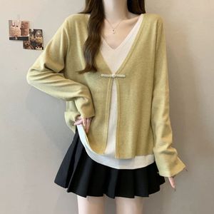 300斤特大码拼接假两件V领针织开衫毛衣女胖mm新中式盘扣复古上衣