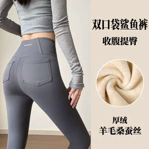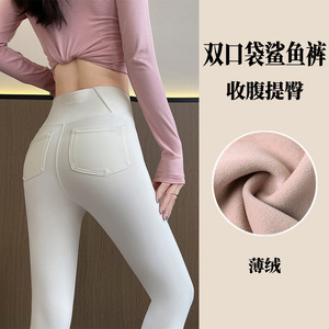 时尚百搭双口袋鲨鱼裤女外穿秋冬加绒加厚高腰修身显瘦弹力打底裤