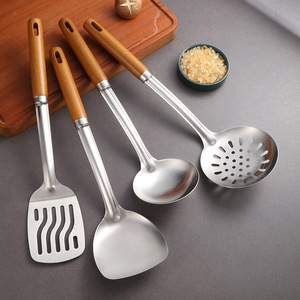 锅铲汤勺漏勺不锈钢暖棕色厨具套装防烫炒菜烹饪勺铲长孔原木把