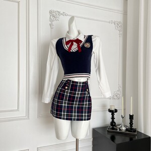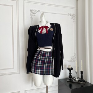 Q3917小众甜辣少女开衫章序蝴蝶结假两件上衣秋新款修身短裙套装