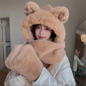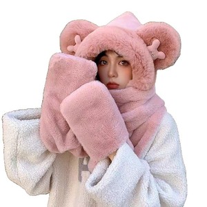 冬季加绒加厚帽子可爱小熊围巾一体女秋冬百搭围脖手套三件套保暖