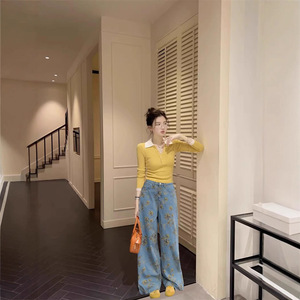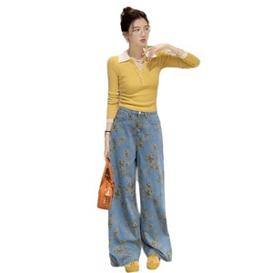 2025年秋季新款设计感百搭气质长袖针织衫高腰印花阔腿牛仔裤套装