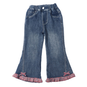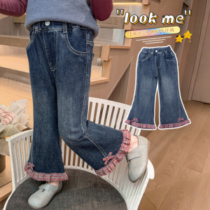 女童牛仔裤春秋款2025新款小女孩格子花边喇叭裤儿童宝宝秋季长裤