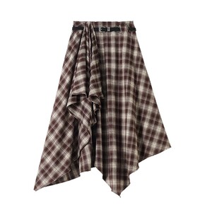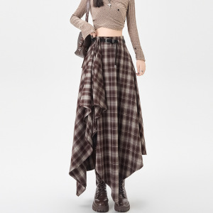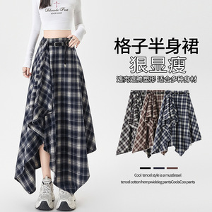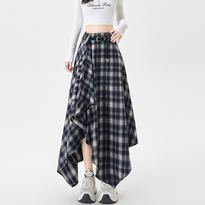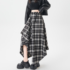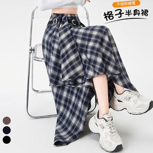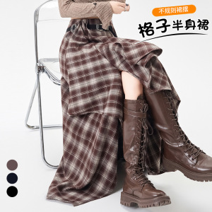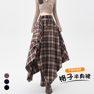 2025秋季新款女装韩版黑格子不规则高腰半身裙小个子中长裙A7127