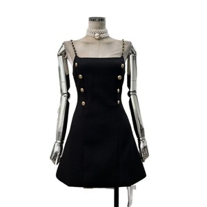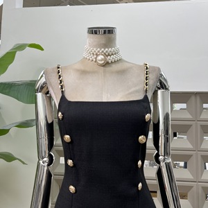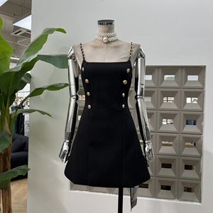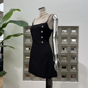 亚马逊洋气高档黑色收腰双排扣设计一字领吊带连衣裙晚会显瘦短款