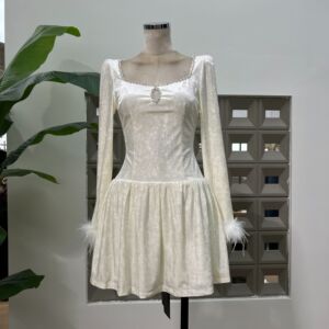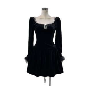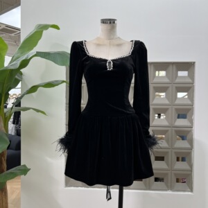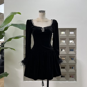 亚马逊娇俏名媛感钻饰方领丝绒长袖羽毛装饰连衣裙INS秋日气质