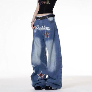 美式复古街头辣妹星星刺绣阔腿牛仔裤女秋季宽松显瘦直筒拖地裤子