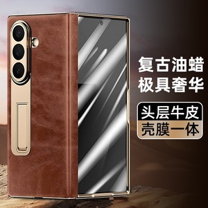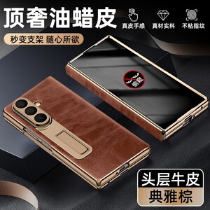 适用三星Z Fold7真皮支架款手机壳高档牛皮油蜡皮纹壳膜一体中轴