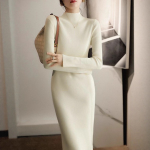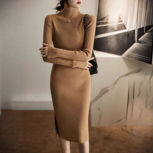 修身内搭打底长袖针织连衣裙子2025秋冬季配大衣的半高领毛衣裙女