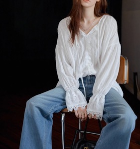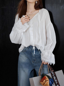法式木耳边装饰系带长袖衬衫女装2025秋季V领提花防晒衫